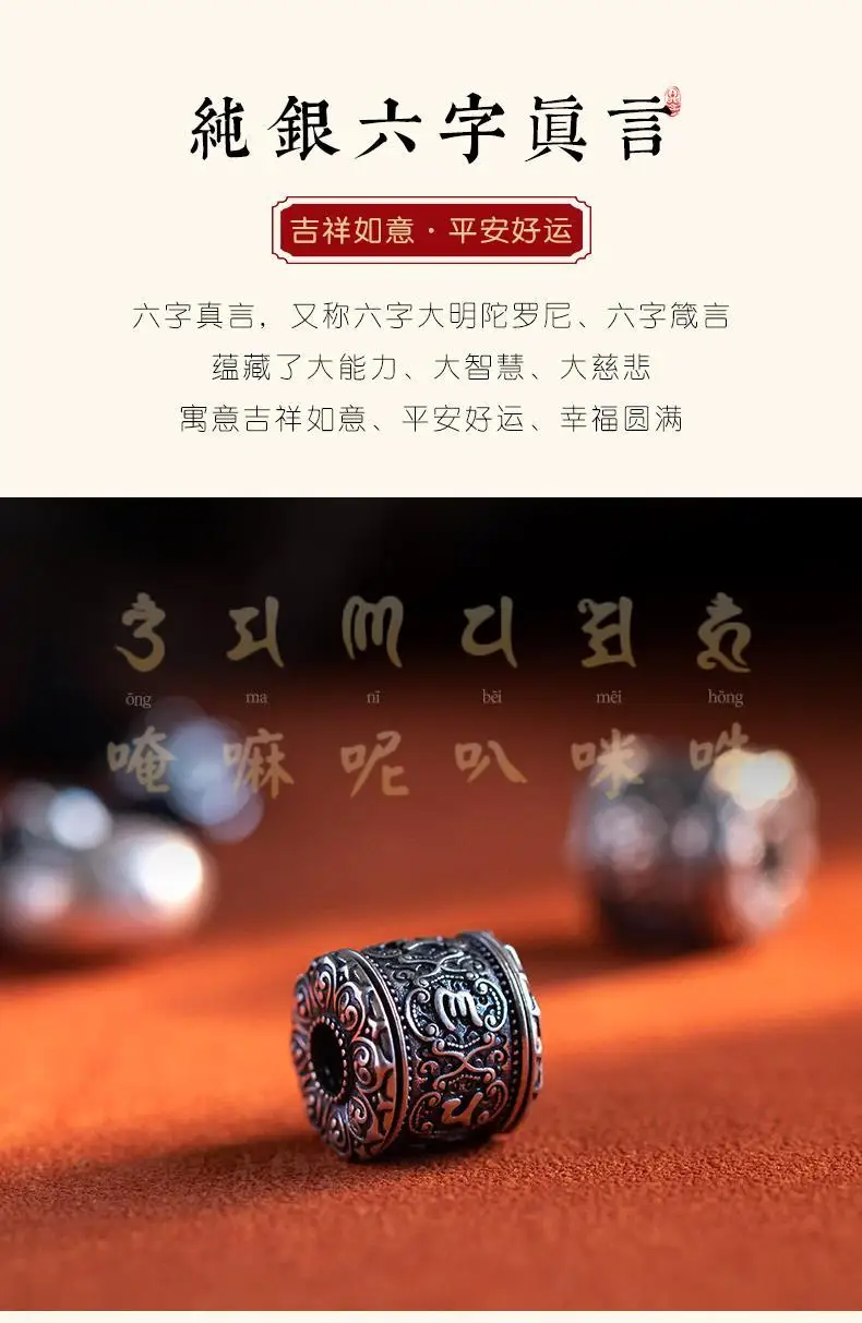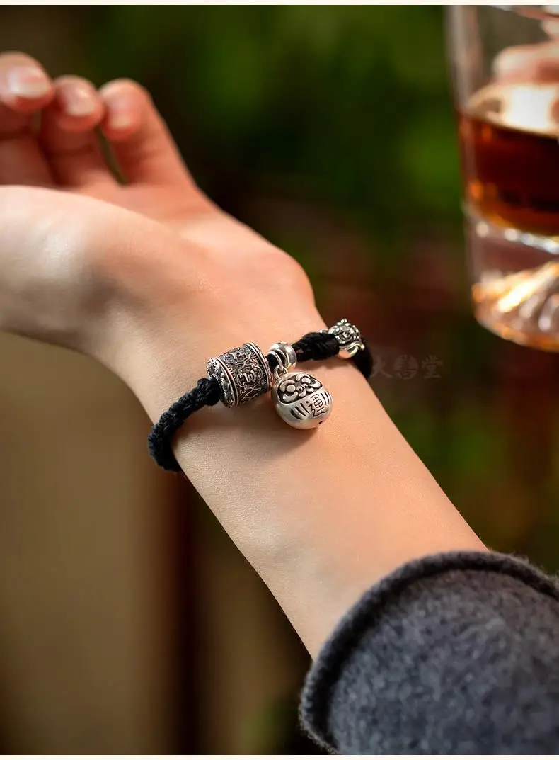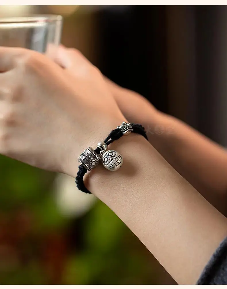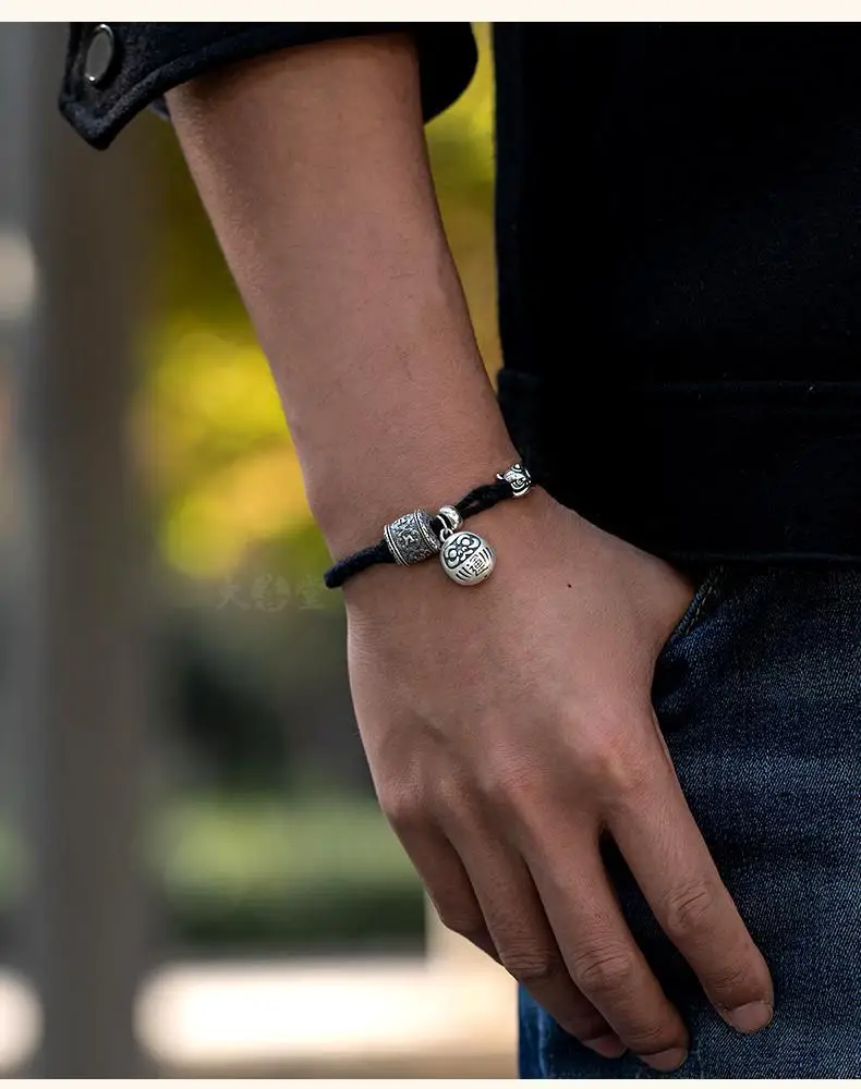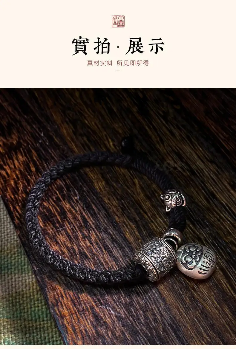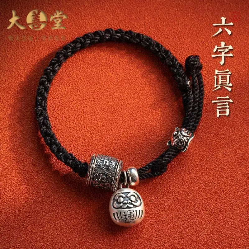 925 Sterling Silver Six-Character True Words Dharma Hand-Woven Black Hand Rope Bracelet for Men and Women Tibetan Hand Jewelry